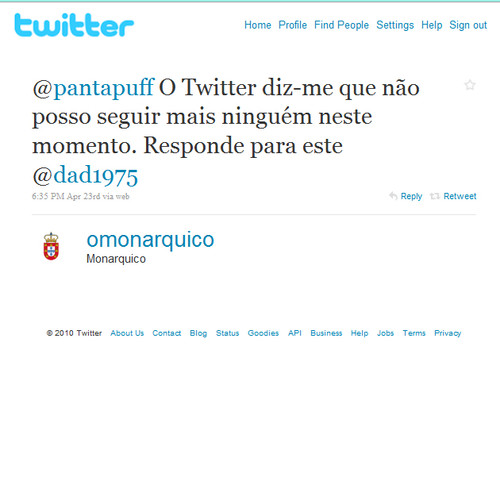 Apanhar este Tweet foi o quanto bastou para descobrir a verdadeira identidade desta pessoa que acha por bem ofender tudo e todos no Twitter. Agora diz que o ameacei quando apenas lhe enviei o mail acima (que encontrei no FaceBook no grupo O Monarquico)