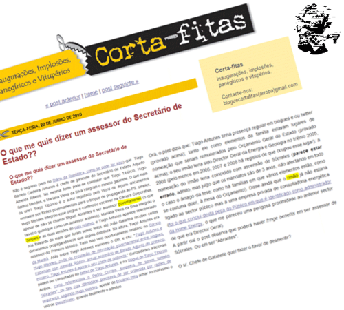 Não sei porquê, ou talvez saiba, mas dá-me algum prazer ver o Carlos Santos tão nervoso, mas tão nervoso, com um mail de um assessor de não sei quem a ameaçá-lo com um processo judicial que, ao escrever as suas justificações, troca "governamental" por "governamentel", "Simplex" por "Simples" e "irmão" por "rimão". A novela continua pelos lados do Corta-Fitas que até era um blogue interessante. Espera-se a qualquer momento que Carlos Santos dê o mesmo por terminado, "tomado de assalto" como ele diz, e o que o mesmo desapareça para sempre. Pelo sim pelo não, façam o download do feed RSS para que não se perca um pedaço do pior que existe na blogoesfera Portuguesa neste momento, para memória futura.