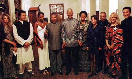 (Imagem: Nelson Mandela is pictured with guests at a party in South Africa in 1997. The interaction of Charles Taylor, Naomi Campbell and Mia Farrow at the event is likely to come under the spotlight at The Hague when Farrow and Campbell appear as witnesses at Taylor's war crimes trial. Photograph: Sipa Press / Rex Features)