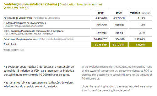 No ano de 2009, a ANACOM além dos custos inerentes à sua participação na FCM (€1.045.649) autorizou um patrocínio de €10.000.000 para a mesma Fundação.